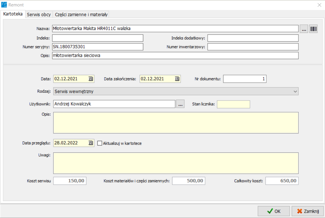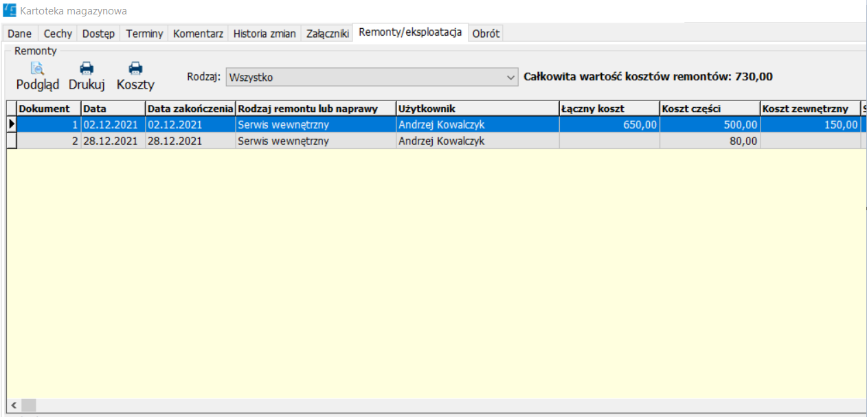 Wydatki na konserwacje środka trwałego są automatycznie sumowane oraz zestawiane z jego ceną zakupu, co pozwala określić granicę opłacalności napraw.