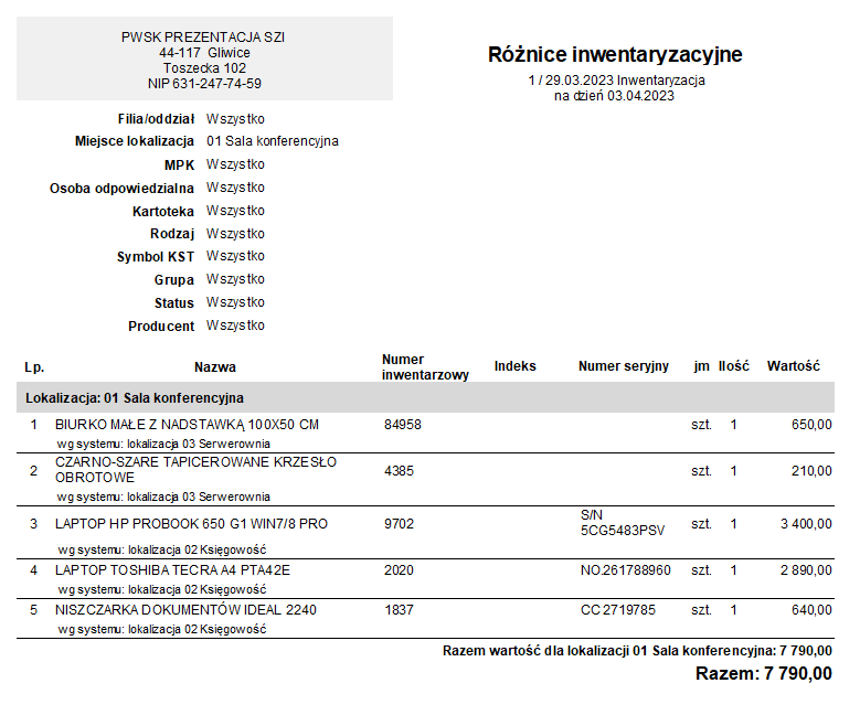 Na koniec otrzymasz dokument wynikowy: wydruk stanu majątku po inwentaryzacji. Zawiera on spis wszystkich zlokalizowanych środków trwałych i wyposażenia. Dzięki temu kolejna inwentaryzacja przebiegnie sprawnie, bez opóźnień i niepotrzebnego marnowania papieru.