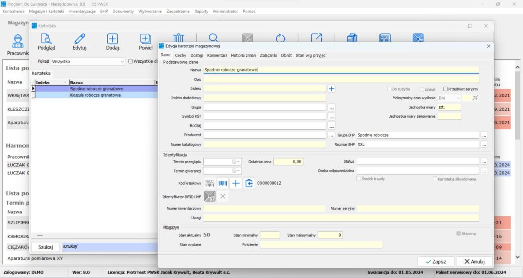 Prowadź kartotekę magazynową BHP wraz z rozbiciem na rodzaje i grupy asortymentu oraz na rozmiary ubrań.