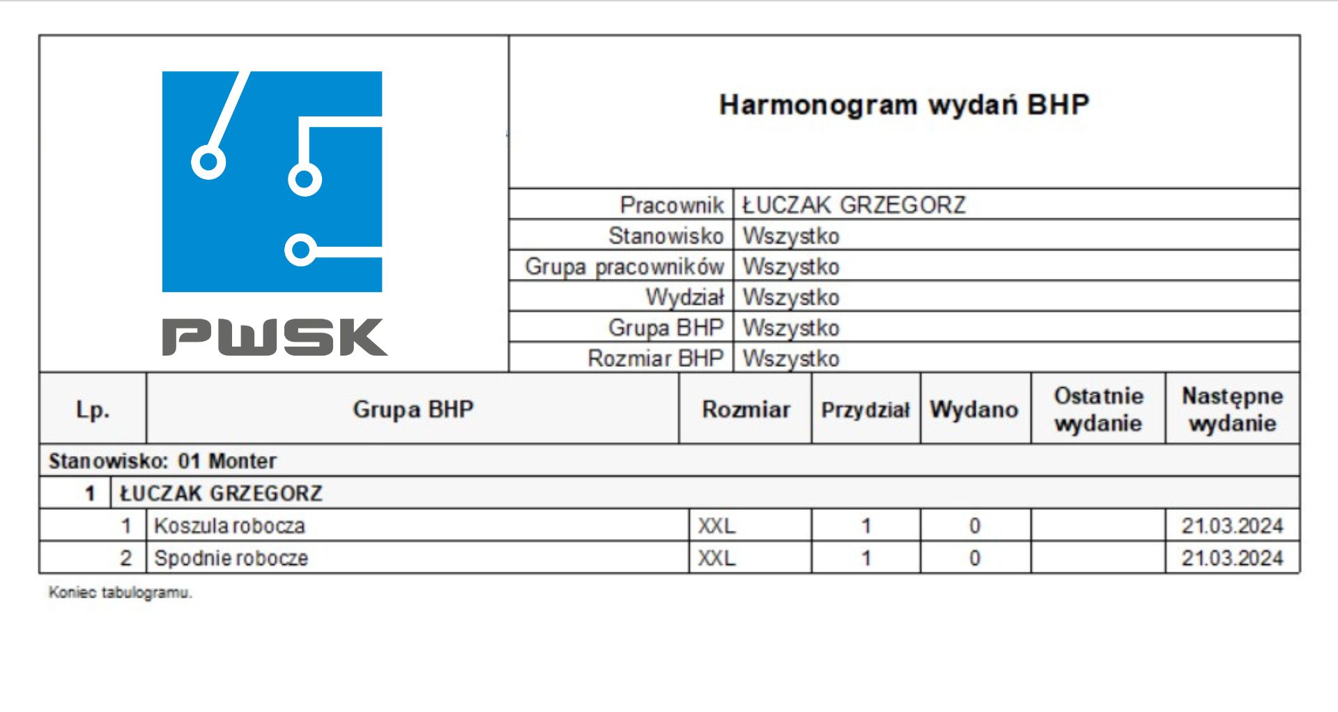 zapamiętywany w systemie, a Ty masz podgląd, co już zostało wydane pracownikowi, a co ma jeszcze zostać wydane.