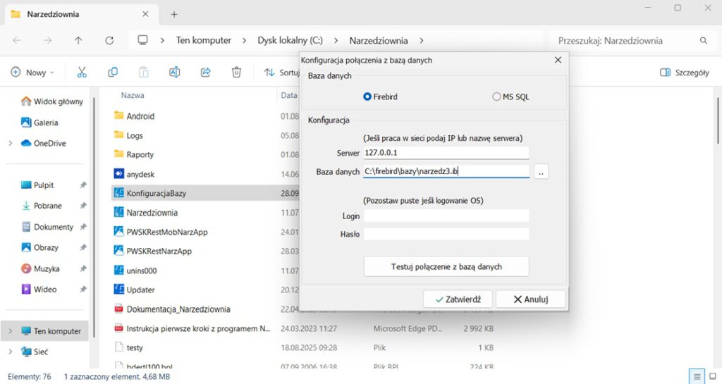 Domyślnie wraz z programem zostanie zainstalowany plik bazodanowy z czystą bazą demo w lokalizacji: C:\firebird\bazy\narzedz3.ib