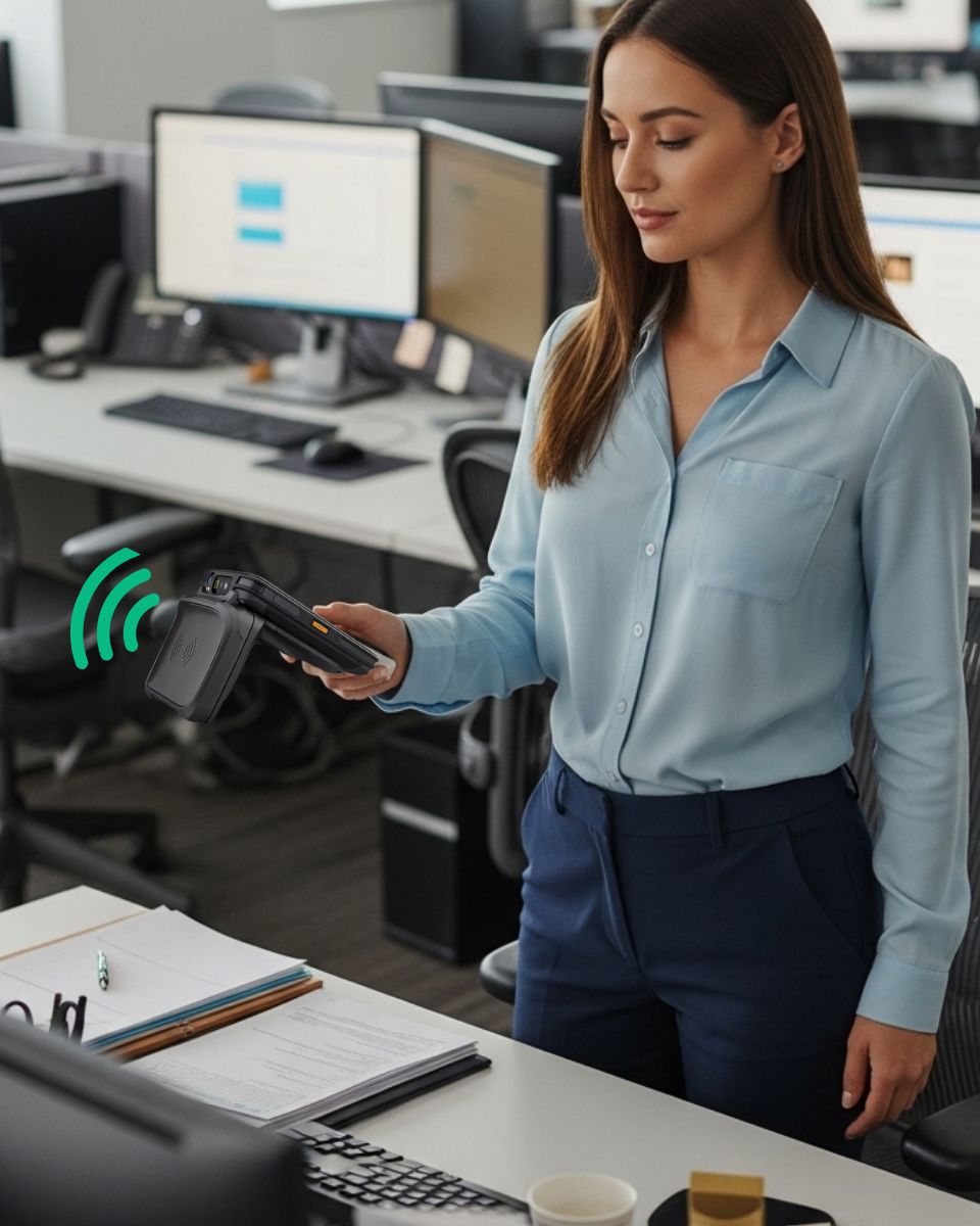 Dzięki RFID inwentaryzacja może być jeszcze szybsza. Zasięg odczytu znaczników RFID dochodzi nawet do 5m, co w połączeniu z kolektorem danych wyposażonym w czytnik RFID UHF oraz naszym oprogramowaniem, sprawi, że Twoja inwentaryzacja osiągnie zupełnie nowy poziom.